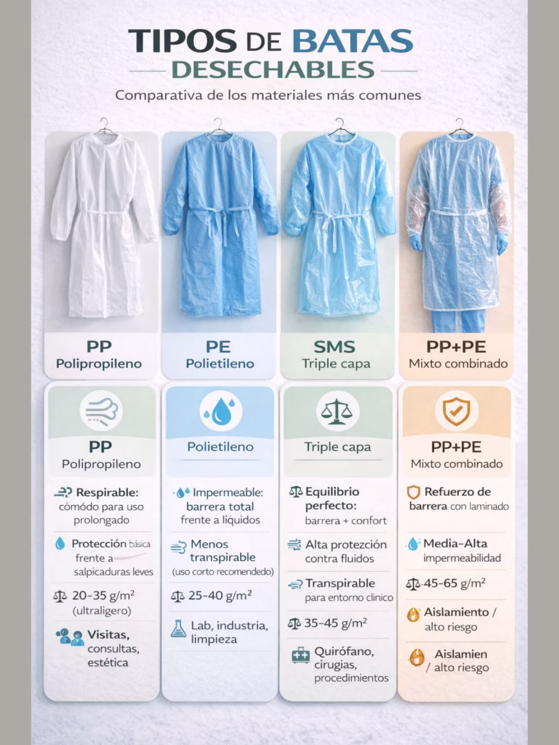 | Bata Médica | PP/SMS | 30-35 g/m² | Medio | Hospitales, clínicas |